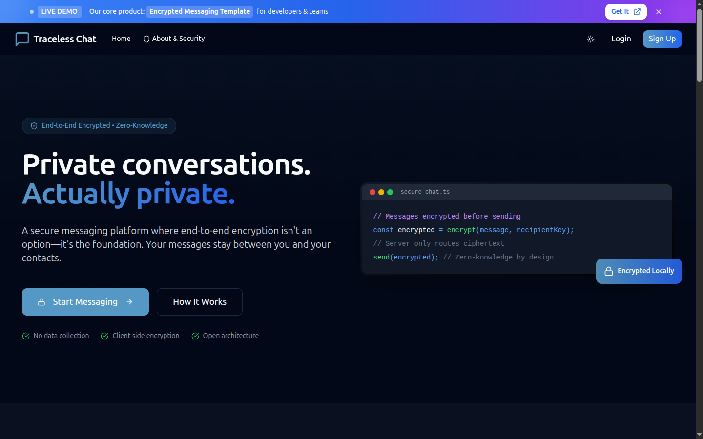 A privacy-first chat application featuring military-grade encryption and disappearing messages. Built for absolute anonymity.